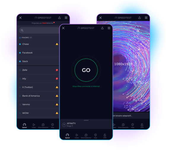 Avec le Speedtest par Ookla®, nous souhaitons rendre l'Internet plus rapide en fournissant des données et des informations concernant les débits réels de l'Internet. Avec des milliards de tests dans le monde, nous venons vers vous où que vous soyez avec des applications pour les appareils que vous utilisez le plus.